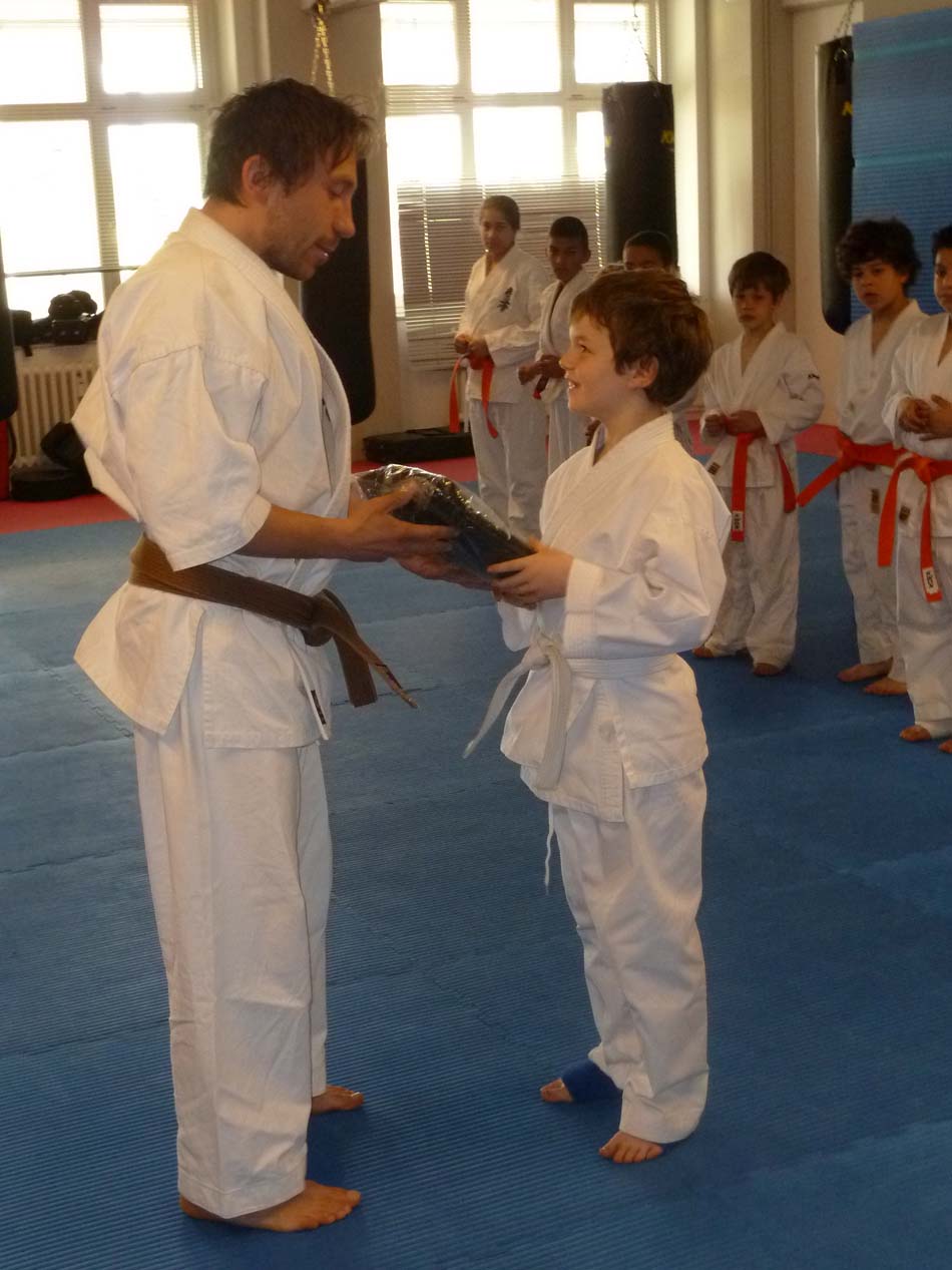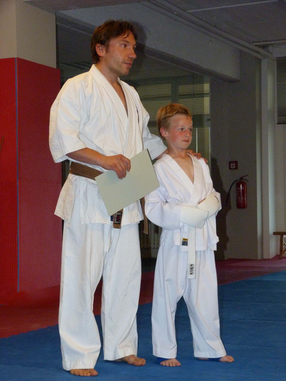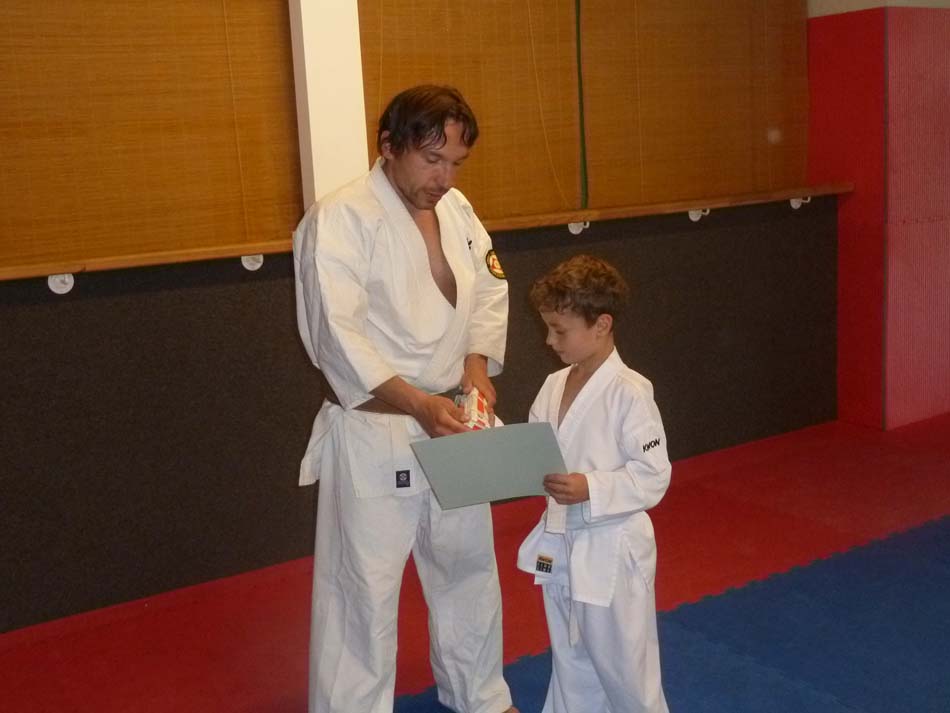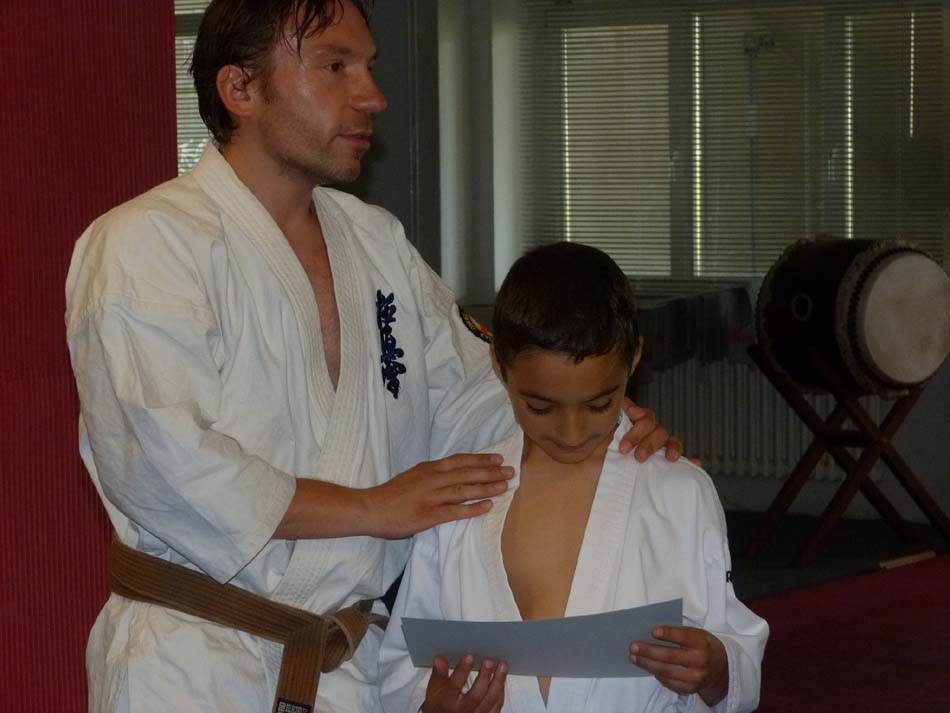 Die Übergabe der Urkunde zur bestandenen Karate Prüfung, sowie des dazu gehörigem Gürtel,